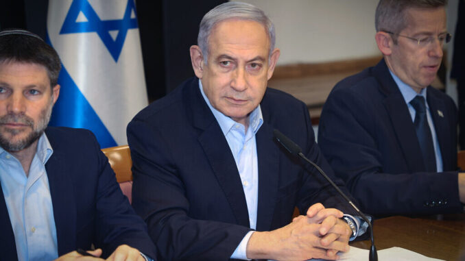 Prime Minister Benjamin Netanyahu leads a cabinet meeting at Hakirya base in Tel Aviv on January 7, 2024. (Yariv Katz/POOL)