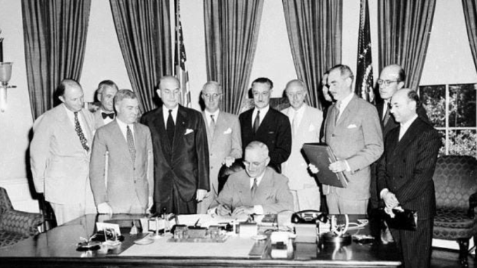 The NATO Treaty was adopted in Washington in 1949. Europe was under siege from surging domestic Communism, the Russians had mostly completed their work of taking over eastern Europe and putting Communist governments in place, and the Berlin Airlift was still underway.