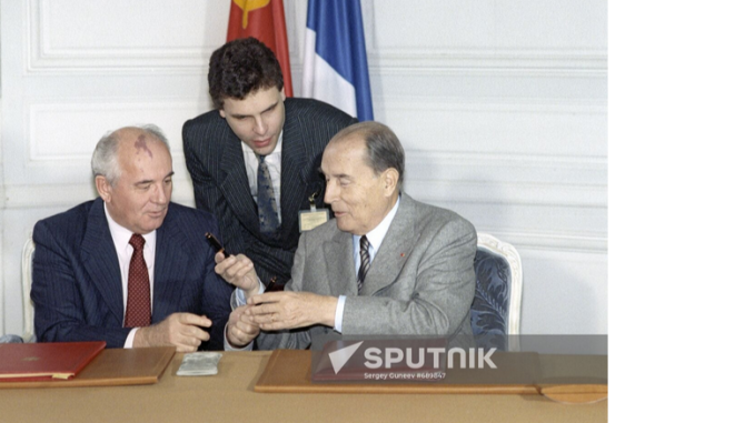Soviet President Mikhail Gorbachev, left, and French President François Mitterrand after signing the agreement on consent and cooperation between the USSR and France during Gorbachev’s working visit to France.
