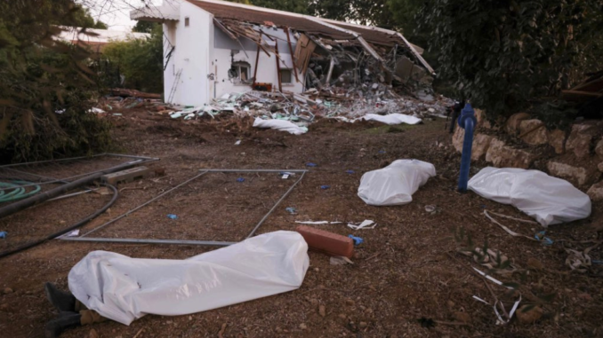 Kibbutz Be’eri is one of 22 Israeli towns and villages that were attacked on October 7, 2023. At the kibbutzim and surrounding areas, a total of around 1,200 people were murdered (including 36 children), thousands more wounded, and more than 250 other abducted (including 30 children) — Jews and non-Jews, Israelis and foreigners, males and females, young and old, civilians and soldiers. It was purposed slaughter, a repeat of the massacres in the shtetls of Europe. Pictured: Covered bodies in front of a destroyed house in Kibbutz Be’eri, photographed on October 11, 2023. (Photo by Menahem Kahana/AFP via Getty Images)