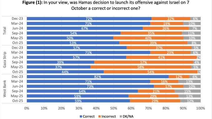 ??Overall, 53% of Palestinians say the decision by Hamas to launch the October 7 attack was correct.