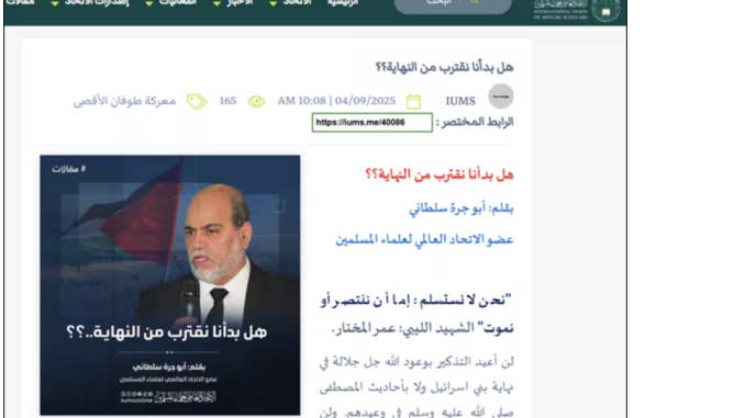 The website of the International Union of Muslim Scholars (IUMS), which is an arm of the Qatari regime that disseminates an extremist Islamist and anti-Western ideology,[1] recently posted an article titled “Is The End in Sight??”, by IUMS member Bouguerra Soltani, formerly the head of Mujtama’ Al-Silm, the Algerian branch of the Muslim Brotherhood. Written against the backdrop of the Gaza war, the article states that the Jews are “the enemies of liberty and world peace” and have failed to learn a lesson from the Holocaust.