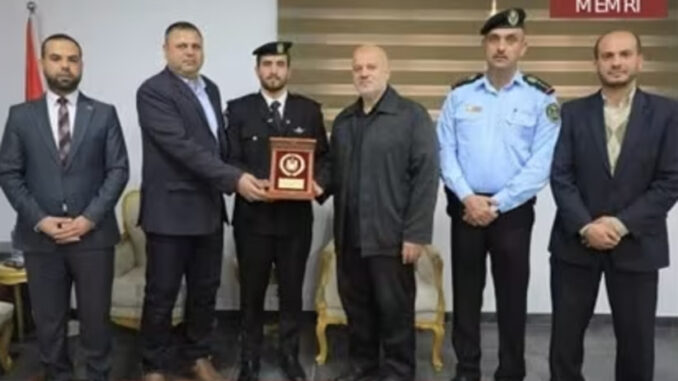 MEMRI posted a photograph of Undersecretary of Hamas’ Interior Ministry,General Nasser Maslah, presenting a certificate of appreciation to officer Nasrallah from March, 2023.