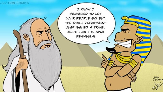 Moses slammed down his staff and proceeded to engulf Egypt with a series of ten plagues causing great harm to the pita factories, as well as to the fishermen on the Nile who could no longer sell fish that turned blood red in color and were covered with locusts. It got worse: the ZAF (Zionist Air Force) bombed the pharaoh’s palace and pulverized his first born. (At least that is the Egyptian version of the story published in al Jazeera, neither of which ever makes up wild stories about Jews.)