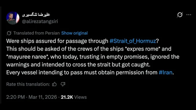 In a tweet hinting at the incident, IRGC Navy Commander Alireza Tangsiri said: “Every vessel intending to pass must obtain permission from Iran.”