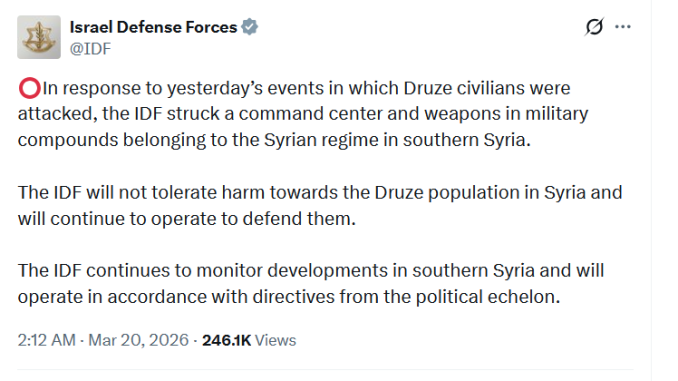 Following regime attacks on Druze civilians, the IDF announced Friday morning it struck command centers and weapons depots in southern Syria, warning it “will not tolerate harm towards the Druze population in Syria and will continue to operate to defend them.”