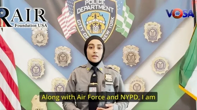 Standing proudly before the American and Pakistani flags, a soon-to-be NYPD officer — the first Pakistani-American woman to serve in both the U.S. Air Force and the New York Police Department — celebrated that both institutions had “accommodated” her Islamic “religious” demands.