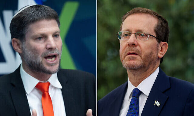 Finance Minister Bezalel Smotrich branded President Isaac Herzog a “leftist” on Tuesday, charging that the president was therefore unable to act as an unbiased mediator in talks for a potential compromise on judicial reform.