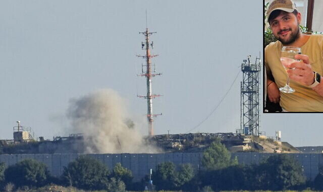 Smoke rises from inside an Israeli army position which was hit by missiles launched by the Hezbollah terror group, as seen from Tair Harfa village, a Lebanese border village with Israel, south Lebanon, October 20, 2023. Inset: Staff Sgt. (res.) Omer Balva, killed in a Hezbollah missile attack. (AP Photo/Hassan Ammar; Israel Defense Forces)