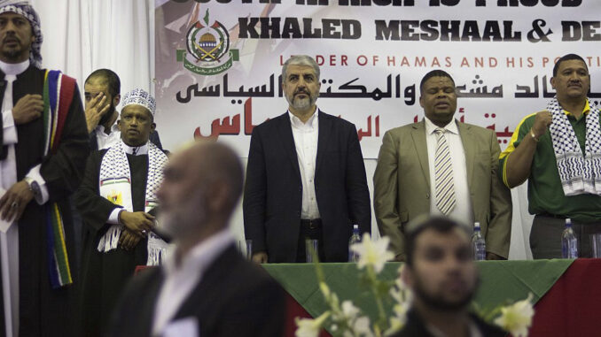 South Africa’s ruling African National Congress (ANC) has close and long-standing ties to the terrorist organization Hamas. As early as 2015, Hamas had developed personal ties with South Africa’s then-President Jacob Zuma. In October 2015, the ANC hosted a Hamas delegation led by terrorist mastermind Khaled Mashaal, who met with Zuma in Pretoria. Pictured: Mashaal (center), at a rally held in his honor on October 21, 2015, in Cape Town, South Africa. (Photo by Rodger Bosch/AFP via Getty Images)