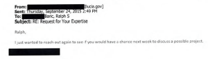 The email exchange with the subject line “Request for Your Expertise” shows an unnamed government official with a CIA-affiliated email address pitching a “possible project” to Baric relating to “[c]oronavirus evolution and possible natural human adaptation.”