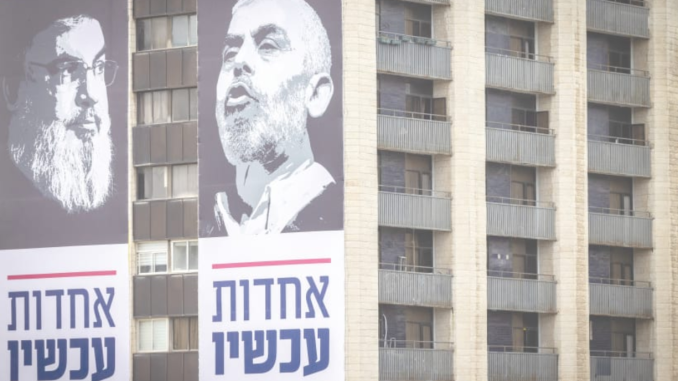LARGE SIGNS in Jerusalem show former Hezbollah leader Hassan Nasrallah and former Hamas leader Yahya Sinwar, each with the words: ‘Unity Now.’ (photo credit: Chaim Goldberg/Flash90)