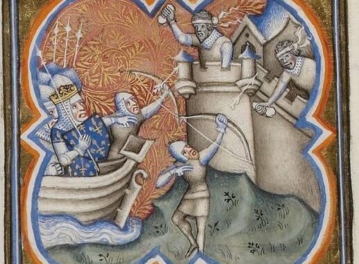 In time, Richard, though still sick, had become even more sick of his impotence. He ordered his moveable tower hauled into “the ditch outside the city wall”; he then “had himself carried out” on his sickbed and placed near his “most skilled crossbowmen” under the tower. The wounded warrior-king did this “to discourage the Saracens with his presence and encourage his own people to fight. There he used his crossbow, with which he was skilled, and killed many.”
