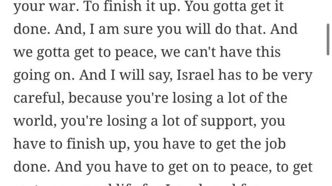 “Look, I know Israel, very well. Spent a lot of time there. And I have a lot of friends there. tremendous number of friends here. They’re incredible people. It’s an incredible place. You have to finish up what you want this through. We gotta get back to having that country again. The way it was so sad that this could have happened.