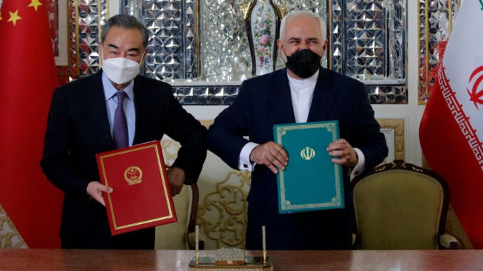 Pictured: Iran’s then Foreign Minister Mohammad Javad Zarif (right) and China’s top diplomatic official, Wang Yi, at the signing of the China-Iran comprehensive strategic 25-year partnership agreement on economic and security cooperation, in Tehran, Iran on March 27, 2021. (Photo by AFP via Getty Images)