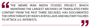 The MEMRI Iran Media Studies Project, which maintains the largest archives of translated Farsi content from the past three decades, has documented the open threats by Iran’s ayatollahs and military figures to attack U.S. interests. These threats, issued in Iranian religious, political, academic, and media venues, have come from top regime officials, including Supreme Leader Ali Khamenei himself, as well as from IRGC and army leaders, Majlis members, and members of regime institutions such as the Assembly of Experts. These officials have not just threatened to attack the U.S. – they claim that they have support within the U.S. to carry out attacks inside it. They are calling for and orchestrating simulations of attacks on the U.S.; their rhetoric, infused with the language of annihilation and genocide, is broadcast live on state television, used in military drills, in Majlis sessions, and in sermons.