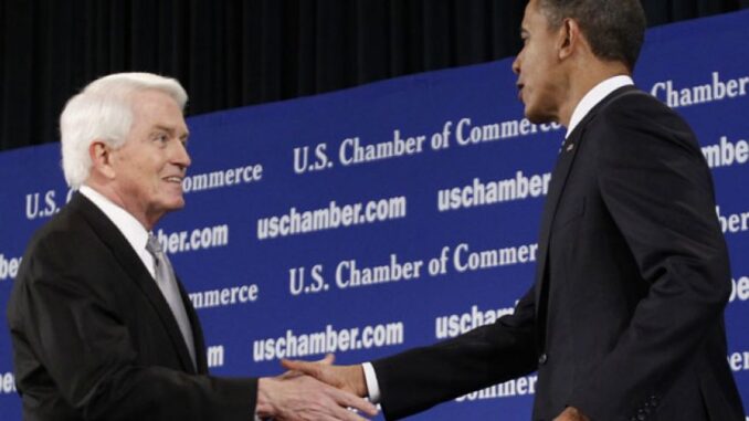 Obama took that same outlook toward U.S. strategic trade interests. This is why President Obama subcontracted trade policy to the President of the U.S. Chamber of Commerce, Tom Donohue (pictured above).