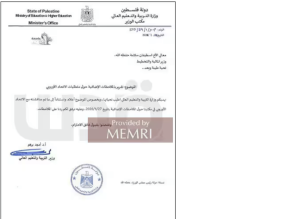 The letter sent by PA Education Minister Amjad Bahram to acting Finance Minister and Minister of Planning and International Cooperation Estephan Salameh presenting Education Ministry comments about the EU demands for changes in the textbooks