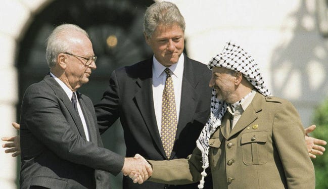 I sound like an idiot. But in my defense, the ground was still trembling in 1993 from the Great Fall of the Soviet Union. It was The End of History, according to Francis Fukuyama. We would all live in free-market democracies forever and all humans would be at peace. By golly, I was only 23-years-old. And the thing happening on my TV was simply heart-stopping: on the White House lawn, PLO Chairman Yasser Arafat was reaching across US President Bill Clinton’s self-satisfied puckered smile to shake the hand of Israeli Prime Minister Yitzhak Rabin! I thought: done deal.