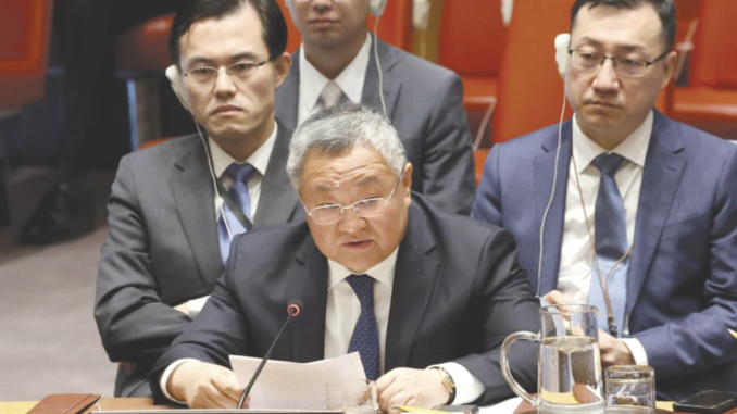 CHINA’S AMBASSADOR Fu Cong speaks at a UN Security Council meeting on the situation in Gaza, earlier this month. Following the horrific attacks of October 7, 2023, China – one of Israel’s most significant business and trade partners – would neither condemn Hamas’s act of terrorism nor provide any h (photo credit: BRENDAN MCDERMID/REUTERS)