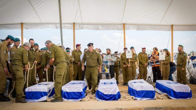 Mourners attend the funeral of five members of the Kotz family, murdered by terrorists on Oct. 7 in Kfar Aza, on Oct. 17, 2023. Photo by Flash90.