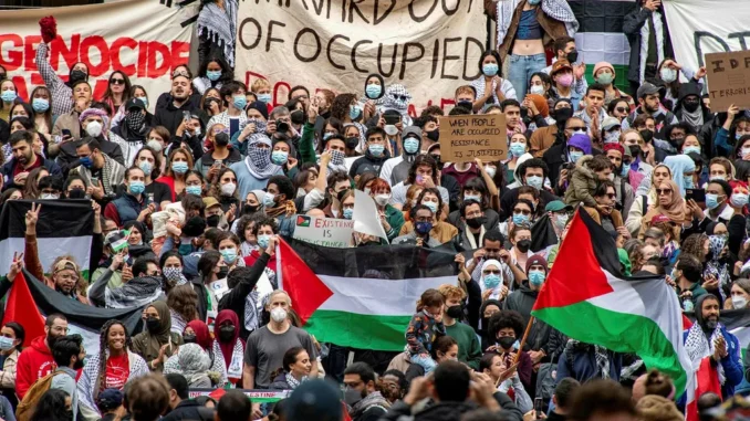 A demonstration at Harvard University to show their support for Palestinians in Gaza at a rally in Cambridge, Massachusetts, on October 14.Credit: JOSEPH PREZIOSO – AFP