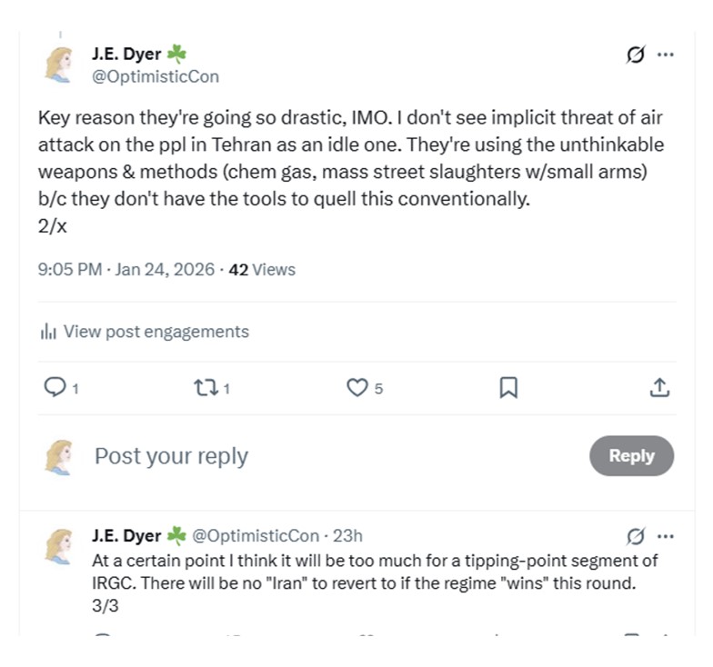 J.E. Dyer, a retired Naval Intelligence officer, blogs as The Optimistic ConservativeJanuary 26, 2026