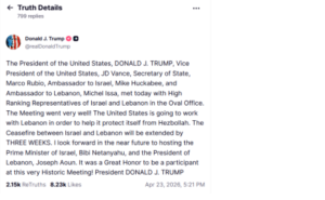 Trump Declares 3 Week Extension on Lebanon Ceasefire