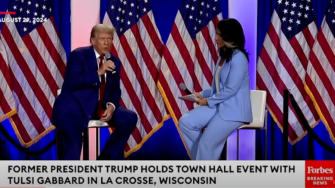 Trump Town Hall With Tulsi Gabbard In La Crosse, Wisconsin Begin Watching at 3 min. 45 sec. August 30, 2024 | Comments »