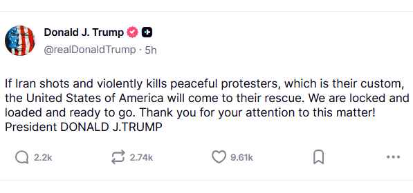 Peloni: Trump offers support to the protestors. What form would that take? He could carry out strikes against the regime, which would include targeting the IRGC or the Basij which is responsible for political enforcement by regime on the people. This would have an immediate effect on the stability of the regime and it would lead to direct support of the protest movement. Alternatively, he could pursue an economic response in the form of enforcing his yet to be enforced trade limits on the sale of Iranian oil which is being exceeded by 20-fold or more. This would have a slightly delayed but profound effect on the regime’s ability to pay its security and armed forces, though it would run afoul of Iran’s largest customer of its oil, China. Ultimately, Trump’s previous statement opposing regime change stands as a contrasting element to his claim to now ‘rescue’ the protestors. So is this a further attempt to apply pressure for the Mullahs to negotiate, or is it a sincere statement of support which the Iranian people can rely upon?