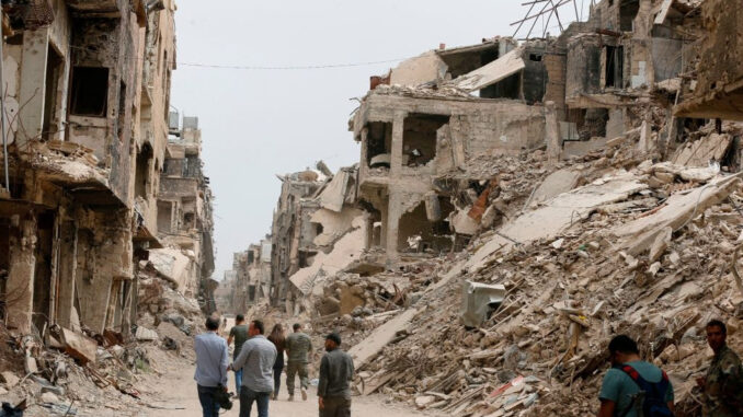 Members of the Syrian pro-government forces inspect the damage of a street in the Yarmuk Palestinian refugee camp on the southern outskirts of the capital Damascus on May 22, 2018. – The government seized earlier in the week the Yarmuk Palestinian camp and adjacent neighbourhoods of Tadamun and Hajar al-Aswad from the Islamic State (IS) group , putting Damascus fully under its control for the first time since 2012. (Photo by LOUAI BESHARA / AFP)
