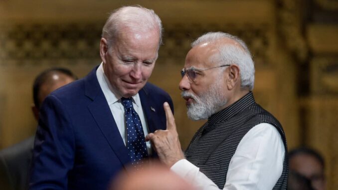 US President Joe Biden talks with India’s Prime Minister Narendra Modi at the opening of the G20 Summit, November 15, 2022. Photo credit: BAY ISMOYO/Pool via REUTERS