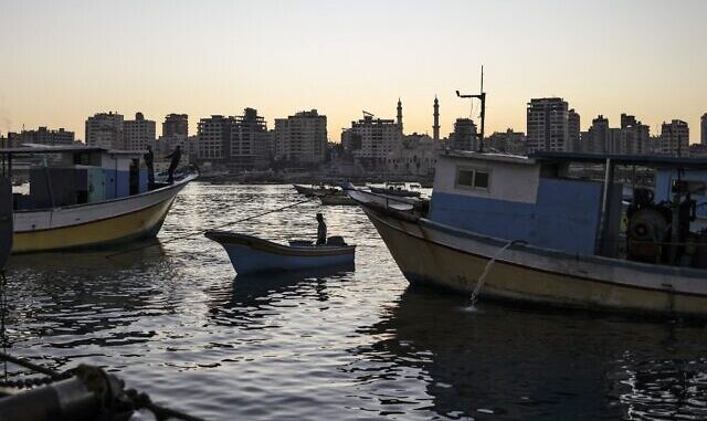 A Palestinian fisherman arrives with a boat at the port Gaza City early on December 1, 2022. (Ronaldo Schemidt/AFP)