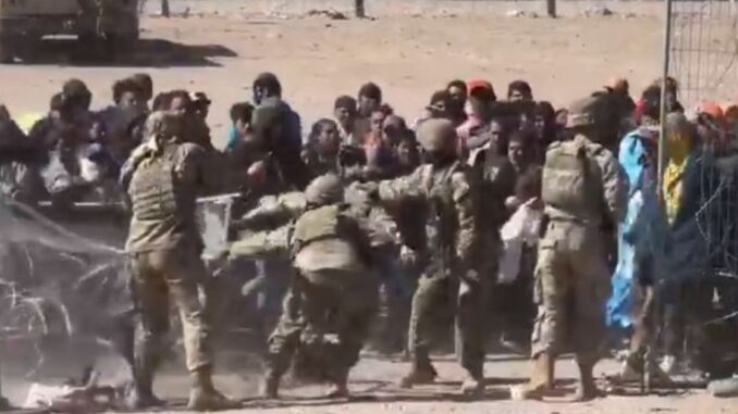 Texas National Guard members are seen being overrun by illegal immigrants trying to force their way across the southern border at El Paso, Texas. (@JennieSTaer / X screen shot)
