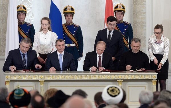 Vladimir Putin signs the treaty of accession (annexation) with Crimean leaders in 2014 (Photo credit: Kremln.ru)