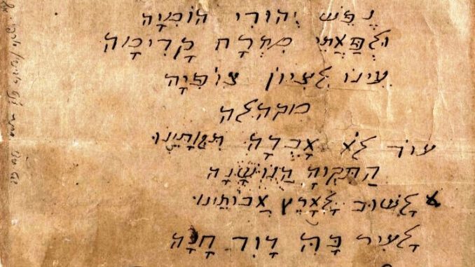 The first verse and chorus of “Hatikvah” in the handwriting of Naftali Hertz Imber (Photo is available from National Library of Israel under the digital ID. 990034175550205171 (003417555), Public Domain)